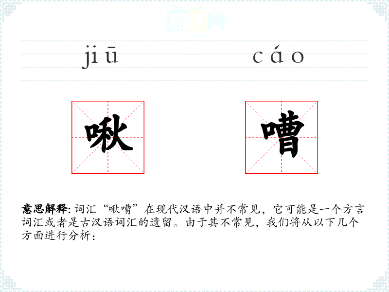 词汇“啾嘈”在现代汉语中并不常见,它可能是一个方言词汇或者是古汉语词汇的遗留。由于其不常见,我们将从以下几个方面进行分析: