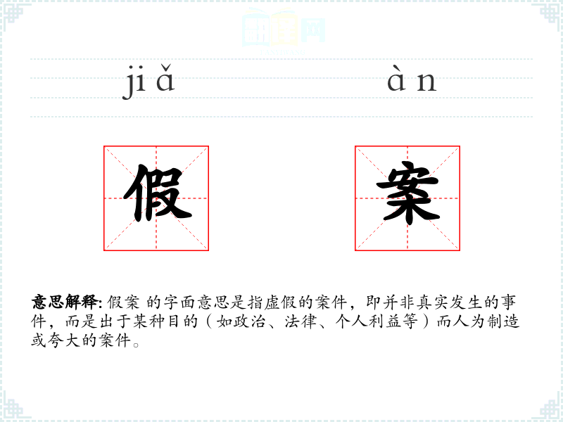 假案 这个词由“假”和“案”两个字组成。“假”字有虚假、不真实的意思,“案”字在法律语境中指案件。这个词可能在法律实践中逐渐形成,用以描述那些被揭露为虚假的法律案件。