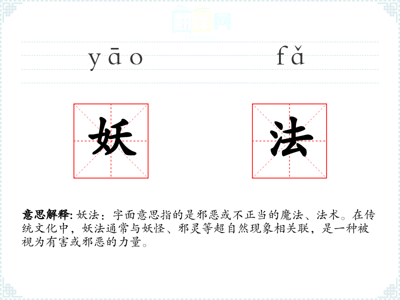 妖法:字面意思指的是邪恶或不正当的魔法、法术。在传统文化中,妖法通常与妖怪、邪灵等超自然现象相关联,是一种被视为有害或邪恶的力量。