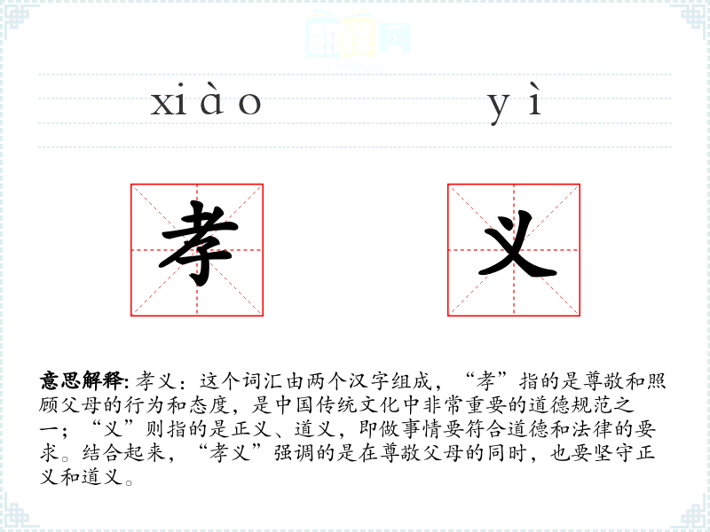 “孝”字最早见于甲骨文,原意是孩子在老人面前恭敬的样子,后来逐渐演变为尊敬和照顾父母的道德规范。“义”字则源于古代的“仪”,意为仪式、规矩,后来引申为道德和法律的要求。