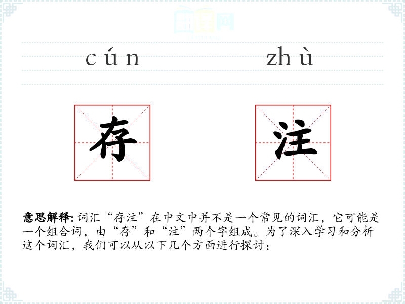 词汇“存注”在中文中并不是一个常见的词汇,它可能是一个组合词,由“存”和“注”两个字组成。为了深入学习和分析这个词汇,我们可以从以下几个方面进行探讨: