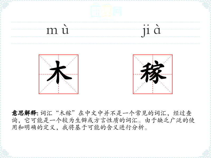 词汇“木稼”在中文中并不是一个常见的词汇,经过查询,它可能是一个较为生僻或方言性质的词汇。由于缺乏广泛的使用和明确的定义,我将基于可能的含义进行分析。