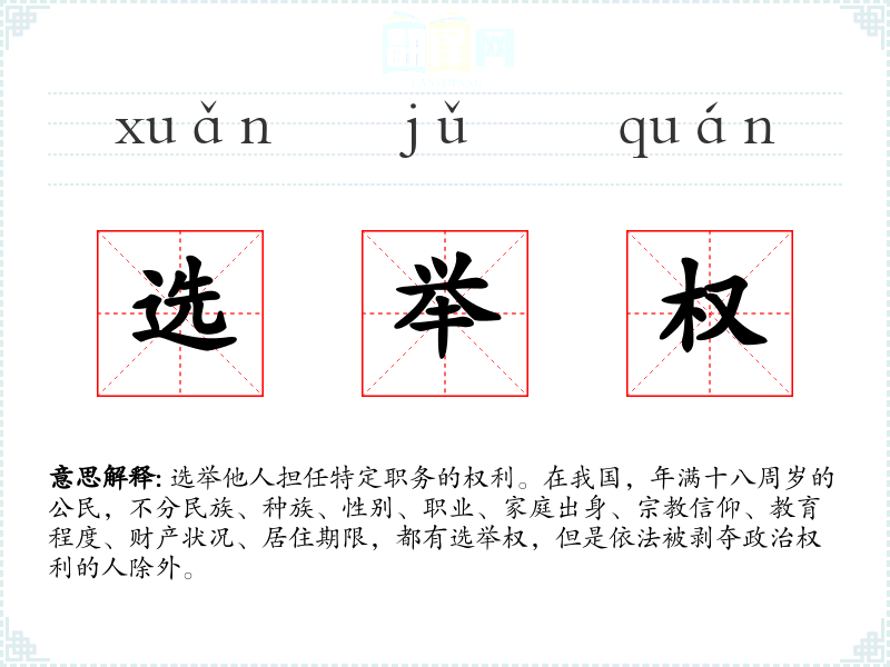 选举他人担任特定职务的权利。在我国,年满十八周岁的公民,不分民族、种族、性别、职业、家庭出身、宗教信仰、教育程度、财产状况、居住期限,都有选举权,但是依法被剥夺政治权利的人除外。