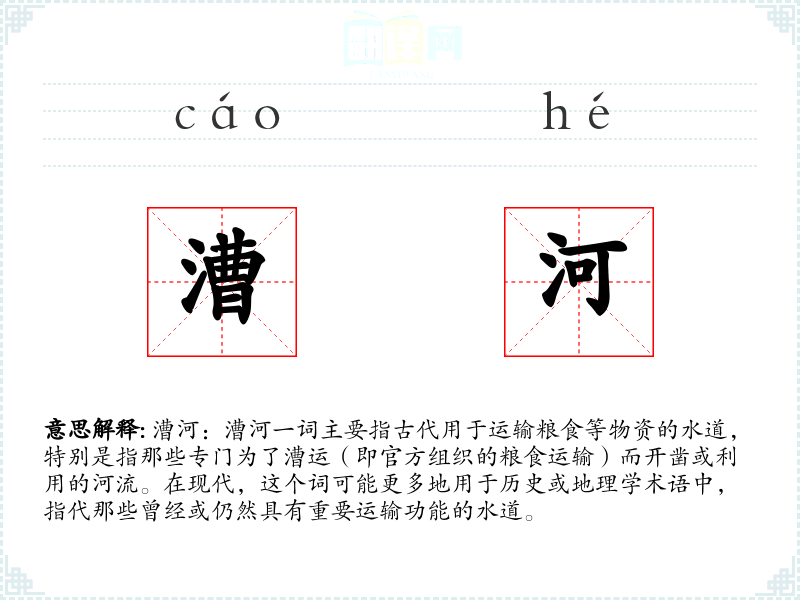 漕河:漕河一词主要指古代用于运输粮食等物资的水道,特别是指那些专门为了漕运(即官方组织的粮食运输)而开凿或利用的河流。在现代,这个词可能更多地用于历史或地理学术语中,指代那些曾经或仍然具有重要运输功能的水道。