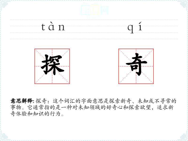 探奇:这个词汇的字面意思是探索新奇、未知或不寻常的事物。它通常指的是一种对未知领域的好奇心和探索欲望,追求新奇体验和知识的行为。