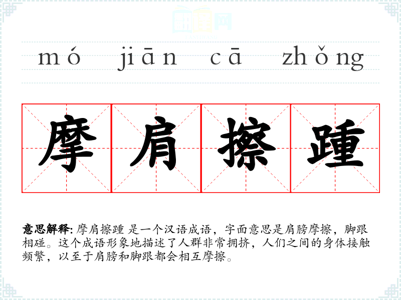 摩肩擦踵 是一个汉语成语,字面意思是肩膀摩擦,脚跟相碰。这个成语形象地描述了人群非常拥挤,人们之间的身体接触频繁,以至于肩膀和脚跟都会相互摩擦。