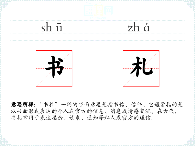 “书札”一词的字面意思是指书信、信件。它通常指的是以书面形式表达的个人或官方的信息、消息或情感交流。在古代,书札常用于表达思念、请求、通知等私人或官方的通信。