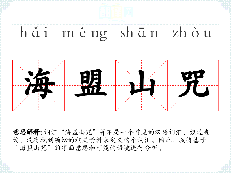 词汇“海盟山咒”并不是一个常见的汉语词汇,经过查询,没有找到确切的相关资料来定义这个词汇。因此,我将基于“海盟山咒”的字面意思和可能的语境进行分析。