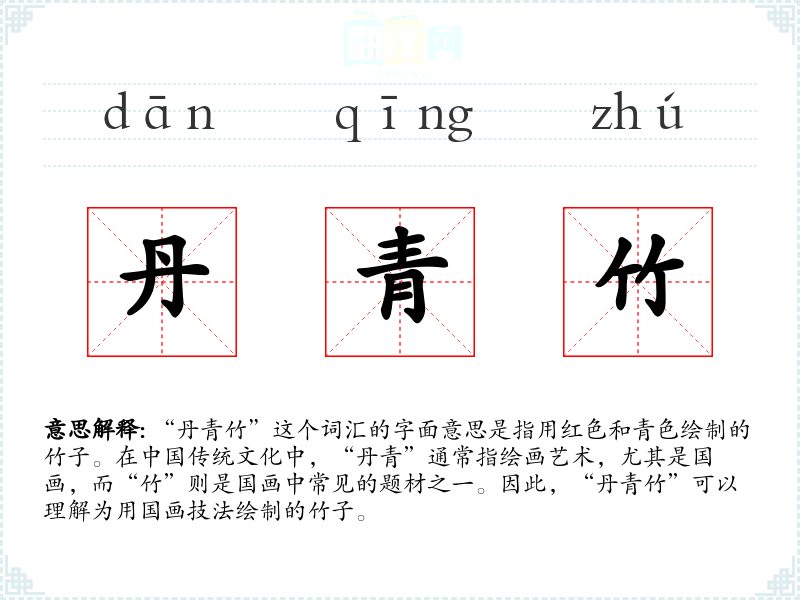 “丹青”一词源自古代对绘画材料的称呼,“丹”指红色,“青”指青色。在古代,这两种颜色是绘画中常用的颜色,因此“丹青”逐渐成为绘画的代称。而“竹”作为绘画题材,自古以来就受到文人墨客的喜爱,因其象征意义和美学价值。