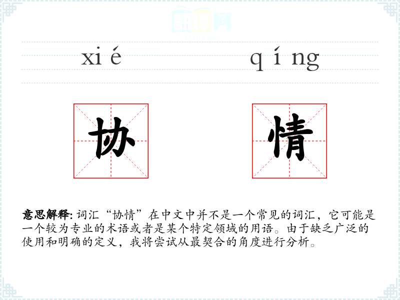 词汇“协情”在中文中并不是一个常见的词汇,它可能是一个较为专业的术语或者是某个特定领域的用语。由于缺乏广泛的使用和明确的定义,我将尝试从最契合的角度进行分析。