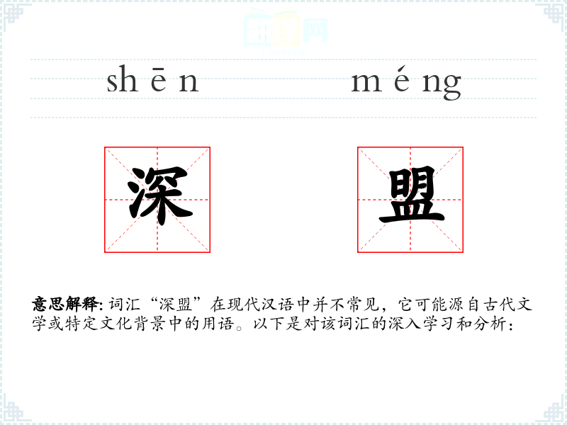 词汇“深盟”在现代汉语中并不常见,它可能源自古代文学或特定文化背景中的用语。以下是对该词汇的深入学*和分析: