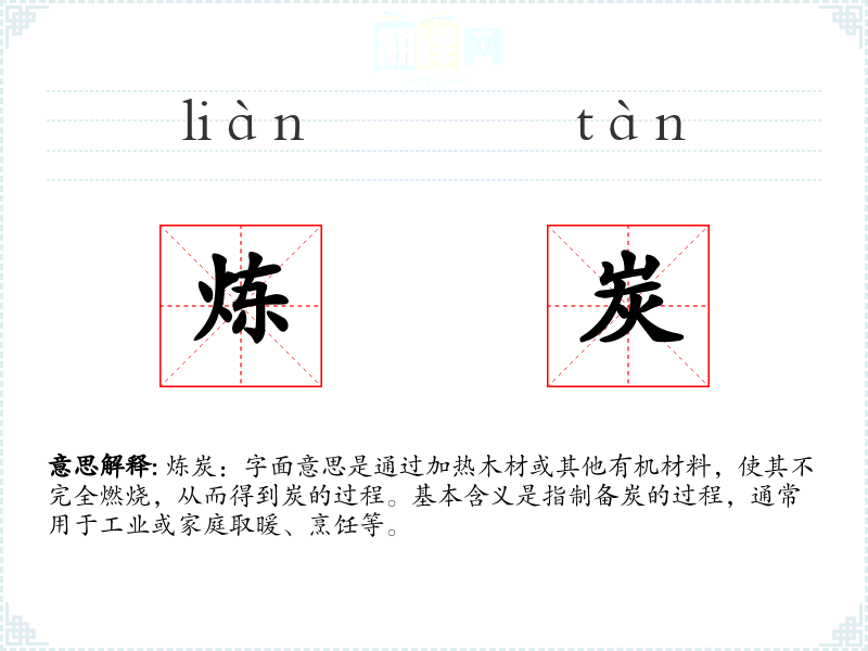 - 反义词:燃烧、焚烧(这些词与炼炭的过程相反,指的是完全燃烧而非不完全燃烧)