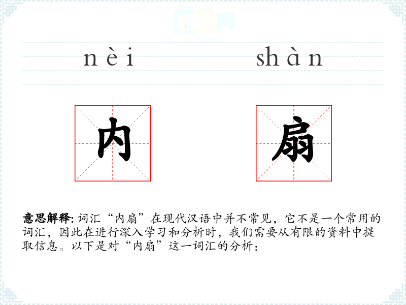 词汇“内扇”在现代汉语中并不常见,它不是一个常用的词汇,因此在进行深入学习和分析时,我们需要从有限的资料中提取信息。以下是对“内扇”这一词汇的分析: