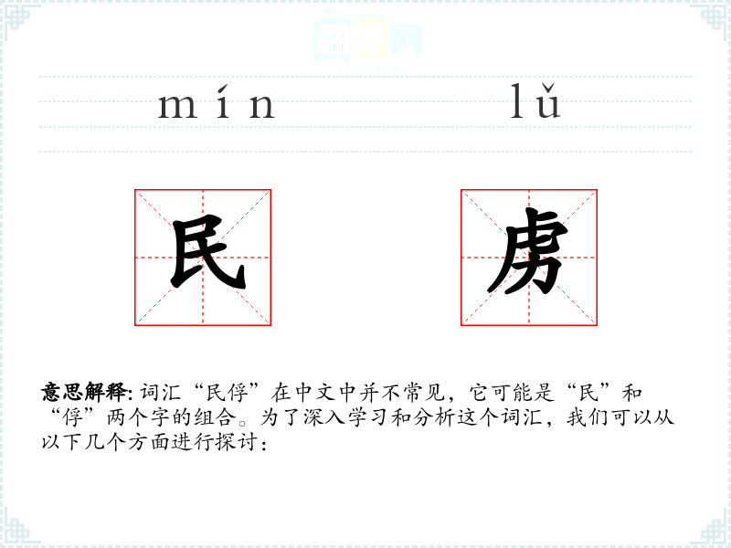 词汇“民俘”在中文中并不常见,它可能是“民”和“俘”两个字的组合。为了深入学*和分析这个词汇,我们可以从以下几个方面进行探讨: