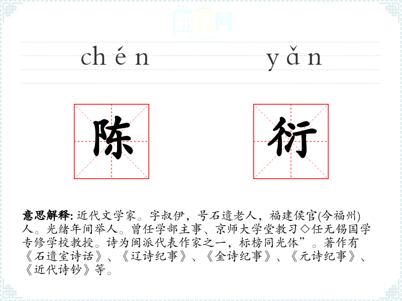 1.近代文学家。字叔伊,号石遗老人,福建侯官(今福州)人。光绪年间举人。曾任学部主事、京师大学堂教习◇任无锡国学专修学校教授。诗为闽派代表作家之一,标榜同光体”。著作有《石遗室诗话》、《辽诗纪事》、《金诗纪事》、《元诗纪事》、《近代诗钞》等。