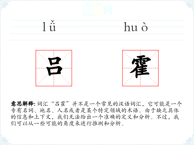 由于“吕霍”不是一个标准词汇,我们无法提供一个确切的字面意思和基本含义。它可能是一个合成词,由“吕”和“霍”两个字组成,这两个字在汉语中都有各自的含义,但组合在一起时可能具有特定的意义。