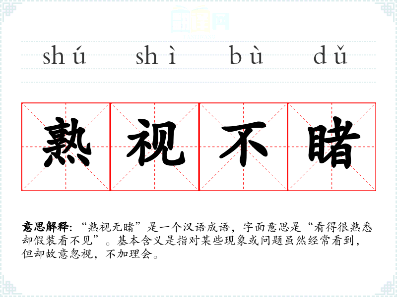 “熟视无睹”是一个汉语成语,字面意思是“看得很熟悉却假装看不见”。基本含义是指对某些现象或问题虽然经常看到,但却故意忽视,不加理会。