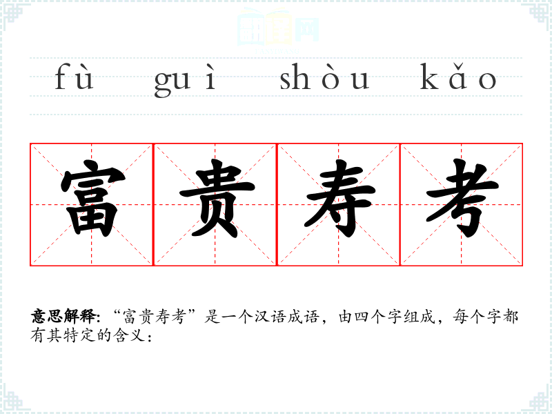 “富贵寿考”是一个汉语成语,由四个字组成,每个字都有其特定的含义: