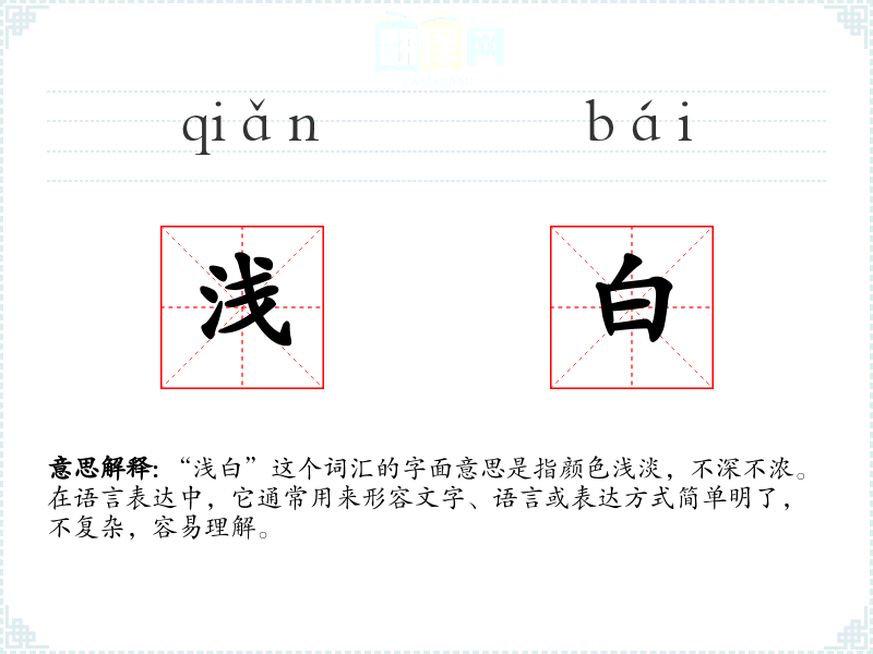 “浅白”这个词汇的字面意思是指颜色浅淡,不深不浓。在语言表达中,它通常用来形容文字、语言或表达方式简单明了,不复杂,容易理解。