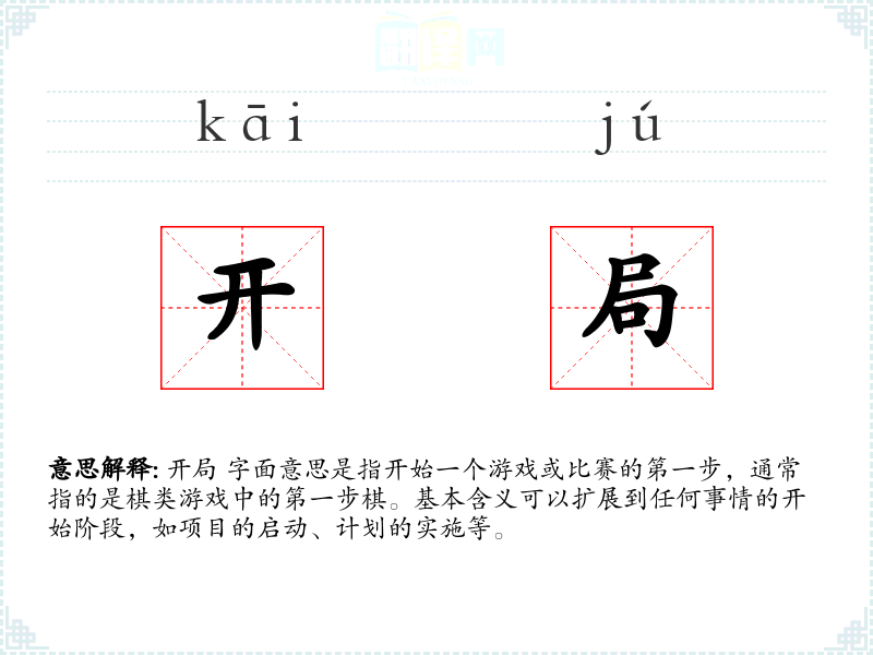- 口语:在日常对话中,“开局”常用来描述任何事情的开始,如“这个项目的开局非常顺利”。