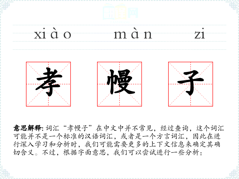 词汇“孝幔子”在中文中并不常见,经过查询,这个词汇可能并不是一个标准的汉语词汇,或者是一个方言词汇,因此在进行深入学*和分析时,我们可能需要更多的上下文信息来确定其确切含义。不过,根据字面意思,我们可以尝试进行一些分析:
