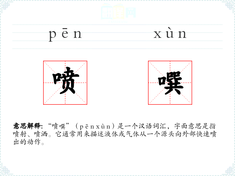 “喷噀”(pēn xùn)是一个汉语词汇,字面意思是指喷射、喷洒。它通常用来描述液体或气体从一个源头向外部快速喷出的动作。