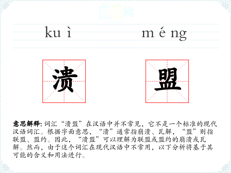 词汇“溃盟”在汉语中并不常见,它不是一个标准的现代汉语词汇。根据字面意思,“溃”通常指崩溃、瓦解,“盟”则指联盟、盟约。因此,“溃盟”可以理解为联盟或盟约的崩溃或瓦解。然而,由于这个词汇在现代汉语中不常用,以下分析将基于其可能的含义和用法进行。