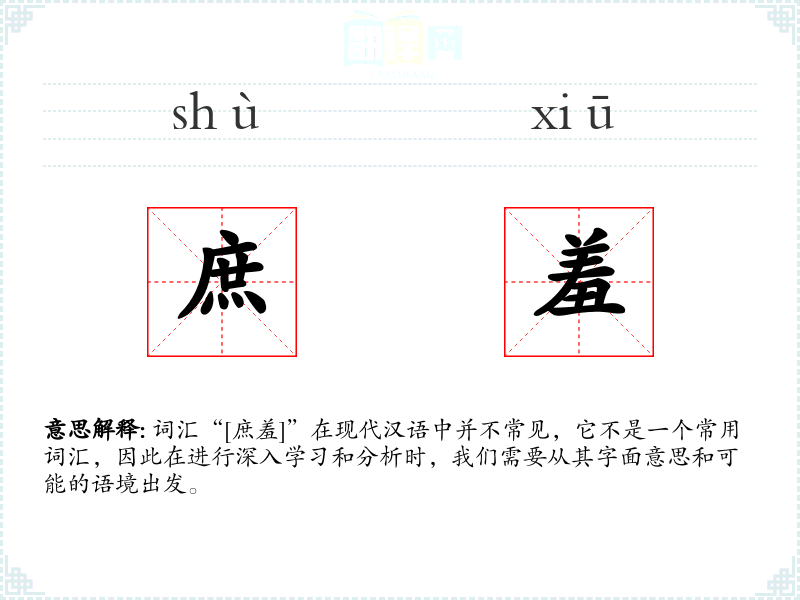 词汇“[庶羞]”在现代汉语中并不常见,它不是一个常用词汇,因此在进行深入学*和分析时,我们需要从其字面意思和可能的语境出发。