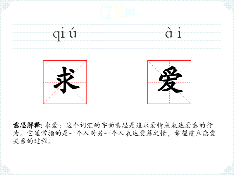求爱:这个词汇的字面意思是追求爱情或表达爱意的行为。它通常指的是一个人对另一个人表达爱慕之情,希望建立恋爱关系的过程。