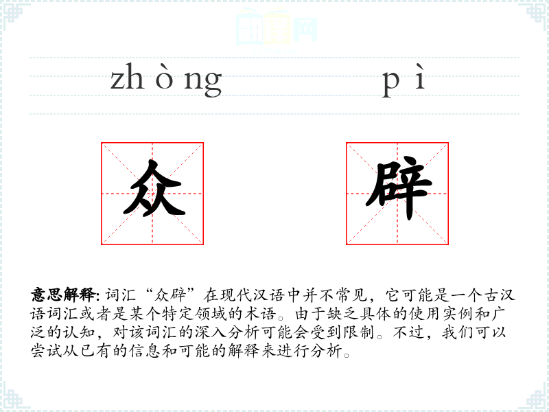 词汇“众辟”在现代汉语中并不常见,它可能是一个古汉语词汇或者是某个特定领域的术语。由于缺乏具体的使用实例和广泛的认知,对该词汇的深入分析可能会受到限制。不过,我们可以尝试从已有的信息和可能的解释来进行分析。