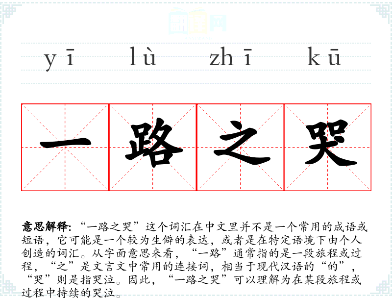 “一路之哭”这个词汇在中文里并不是一个常用的成语或短语,它可能是一个较为生僻的表达,或者是在特定语境下由个人创造的词汇。从字面意思来看,“一路”通常指的是一段旅程或过程,“之”是文言文中常用的连接词,相当于现代汉语的“的”,“哭”则是指哭泣。因此,“一路之哭”可以理解为在某段旅程或过程中持续的哭泣。