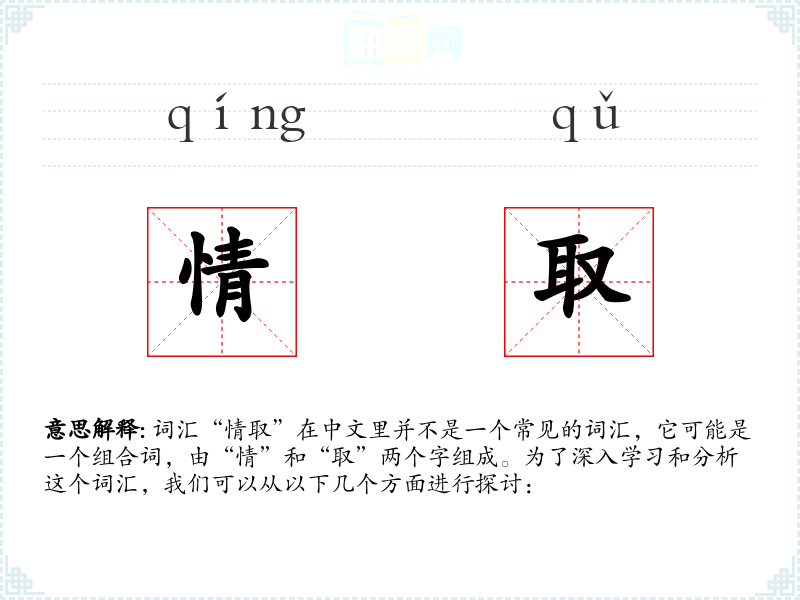 词汇“情取”在中文里并不是一个常见的词汇,它可能是一个组合词,由“情”和“取”两个字组成。为了深入学习和分析这个词汇,我们可以从以下几个方面进行探讨: