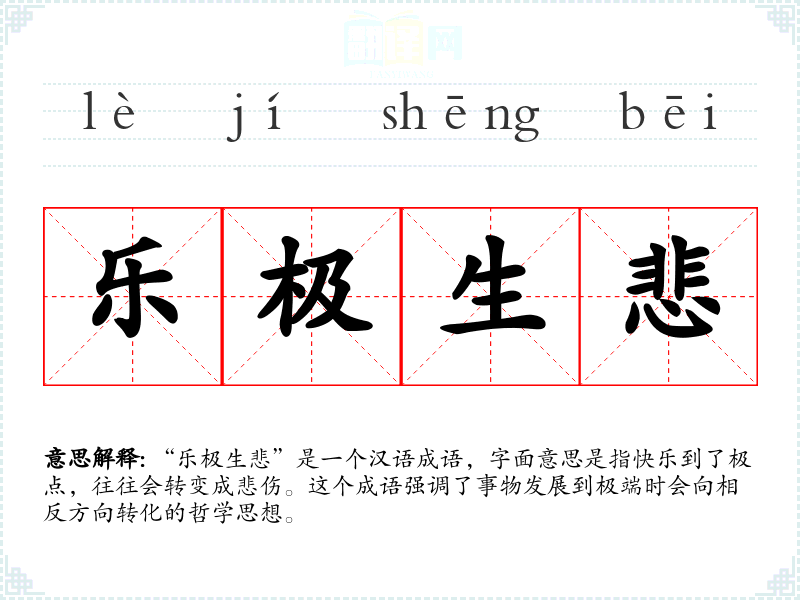 “乐极生悲”是一个汉语成语,字面意思是指快乐到了极点,往往会转变成悲伤。这个成语强调了事物发展到极端时会向相反方向转化的哲学思想。