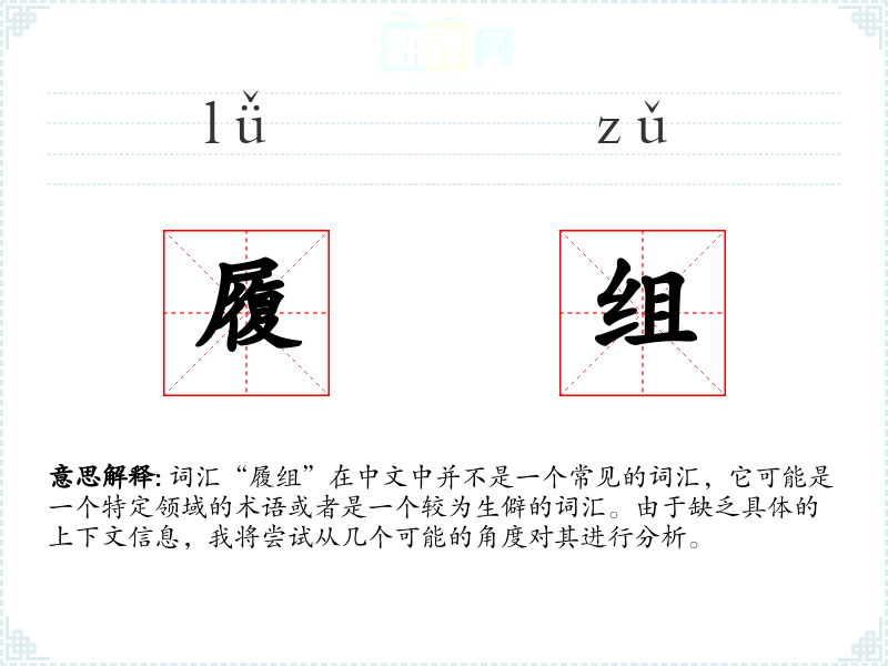 词汇“履组”在中文中并不是一个常见的词汇,它可能是一个特定领域的术语或者是一个较为生僻的词汇。由于缺乏具体的上下文信息,我将尝试从几个可能的角度对其进行分析。