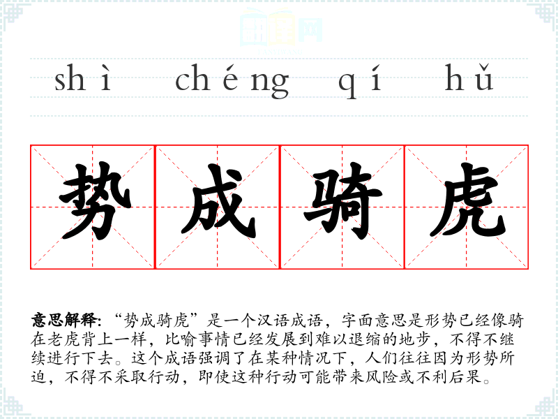 在文学作品中,“势成骑虎”常用来形容主人公在面对困境时,不得不采取冒险的行动。在口语中,这个成语可以用来形容某人在某种压力下,不得不做出某些决定或行动。在专业领域,如商业或政治,这个成语可以用来描述在特定情况下,决策者不得不采取某些策略,即使这些策略可能带来风险。