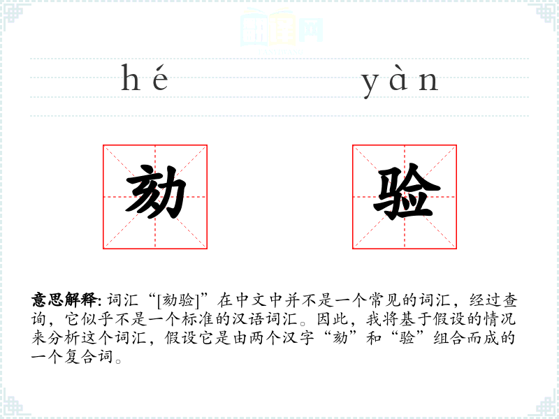 词汇“[劾验]”在中文中并不是一个常见的词汇,经过查询,它似乎不是一个标准的汉语词汇。因此,我将基于假设的情况来分析这个词汇,假设它是由两个汉字“劾”和“验”组合而成的一个复合词。