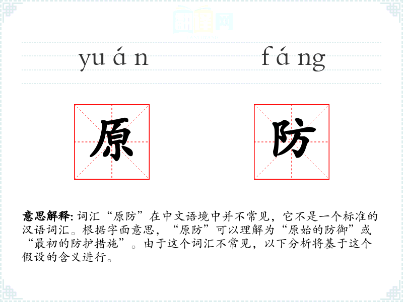 词汇“原防”在中文语境中并不常见,它不是一个标准的汉语词汇。根据字面意思,“原防”可以理解为“原始的防御”或“最初的防护措施”。由于这个词汇不常见,以下分析将基于这个假设的含义进行。