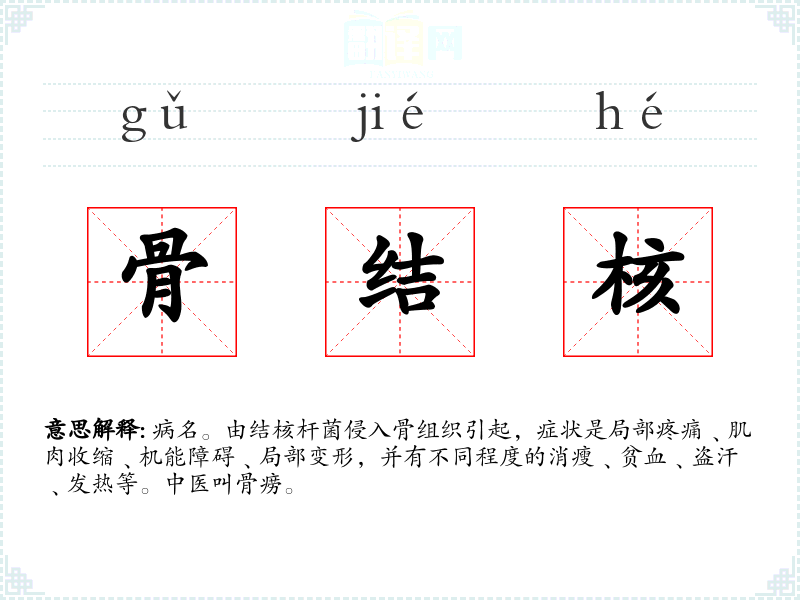 病名。由结核杆菌侵入骨组织引起,症状是局部疼痛﹑肌肉收缩﹑机能障碍﹑局部变形,并有不同程度的消瘦﹑贫血﹑盗汗﹑发热等。中医叫骨痨。