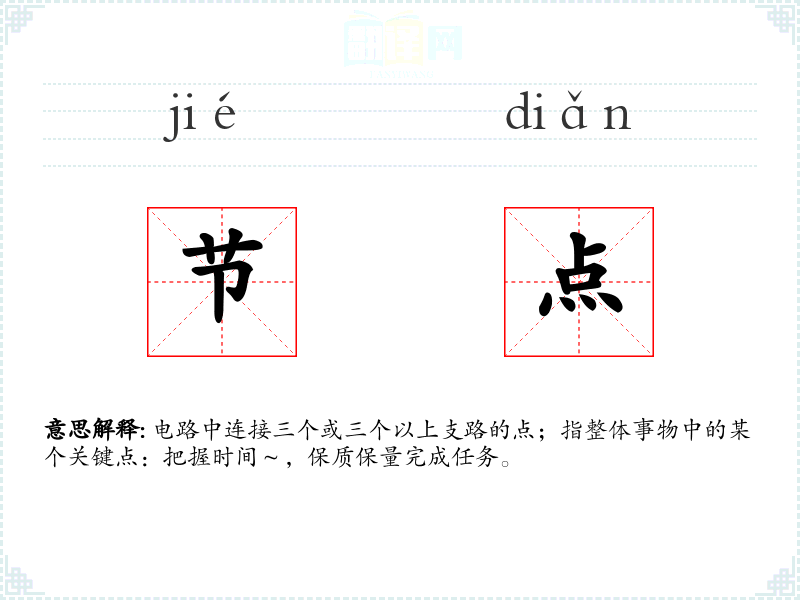 电路中连接三个或三个以上支路的点;指整体事物中的某个关键点:把握时间~,保质保量完成任务。