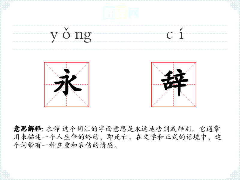 “永辞”一词源自古代汉语,其中“永”表示永远,“辞”表示告别。在古代文献中,这个词常用于描述君主或重要人物的死亡,后来逐渐泛化用于一般人的死亡。