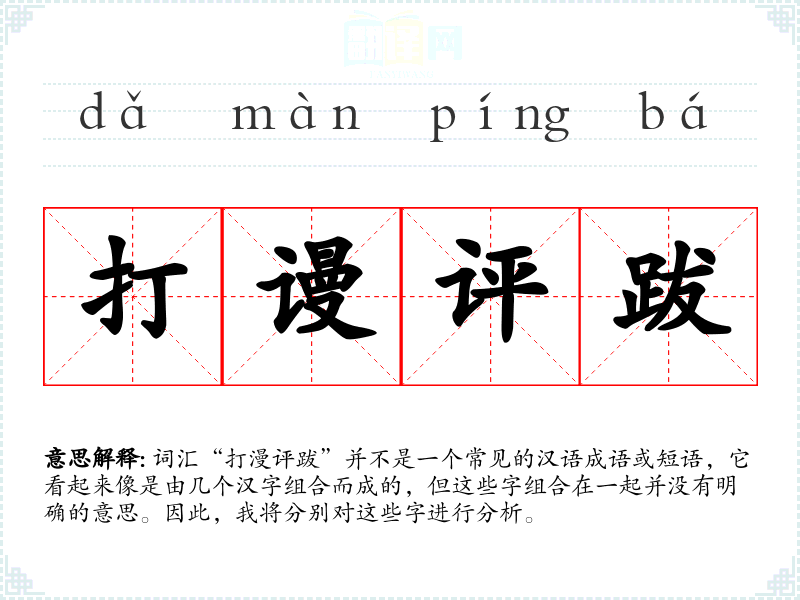 词汇“打漫评跋”并不是一个常见的汉语成语或短语,它看起来像是由几个汉字组合而成的,但这些字组合在一起并没有明确的意思。因此,我将分别对这些字进行分析。