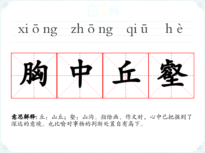 丘:山丘;壑:山沟。指绘画、作文时,心中已把握到了深远的意境。也比喻对事物的判断处置自有高下。