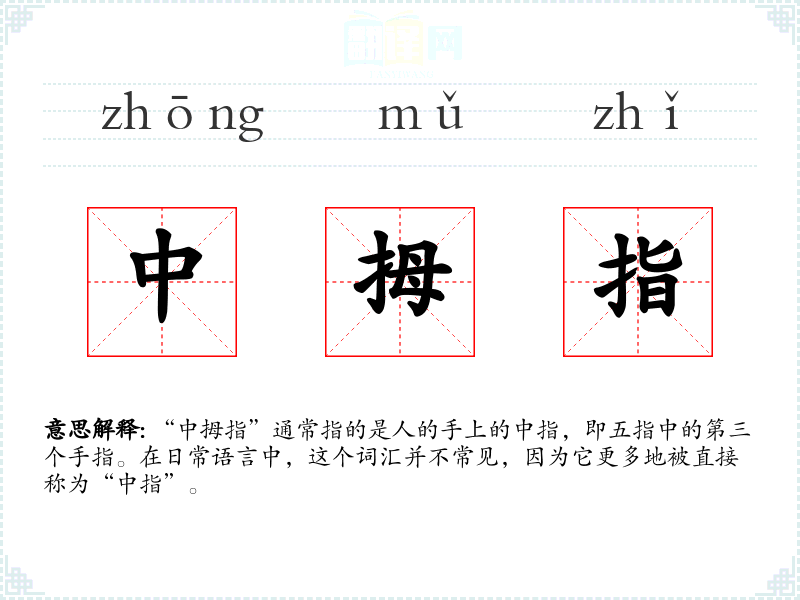 “中拇指”这个词汇可能是“中指”的一个变体,但在现代汉语中并不常见。它的使用可能受到方言或特定地区语言习惯的影响。
