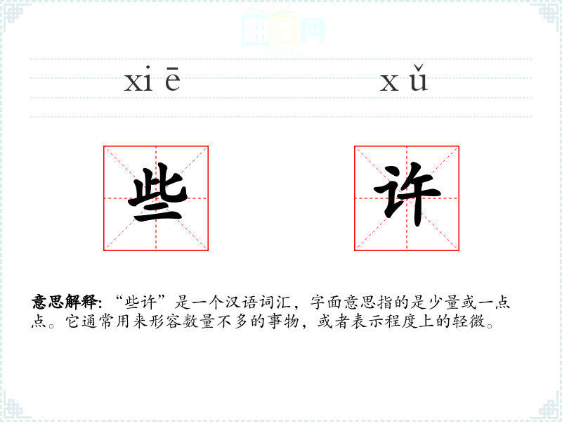 “些许”是一个富有表现力的词汇,它不仅描述了数量的少,还传达了一种细腻和微妙的情感。在我的语言学*和表达中,它帮助我更精确地传达我的思想和感受。