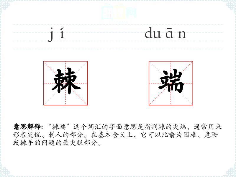 “棘端”这个词汇的字面意思是指荆棘的尖端,通常用来形容尖锐、刺人的部分。在基本含义上,它可以比喻为困难、危险或棘手的问题的最尖锐部分。