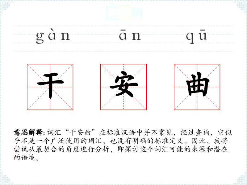 由于“干安曲”不是一个标准词汇,我们无法给出一个确切的字面意思和基本含义。它可能是某个特定地区或社群的方言词汇,或者是某个特定领域的专业术语。