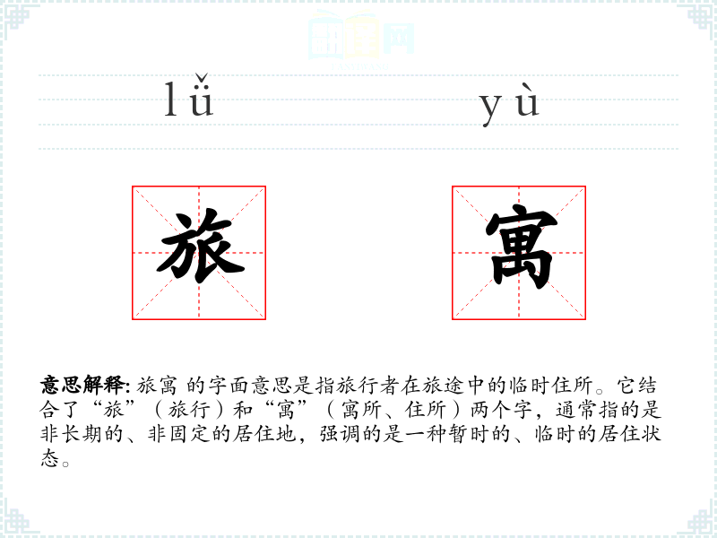 旅寓 的字面意思是指旅行者在旅途中的临时住所。它结合了“旅”(旅行)和“寓”(寓所、住所)两个字,通常指的是非长期的、非固定的居住地,强调的是一种暂时的、临时的居住状态。