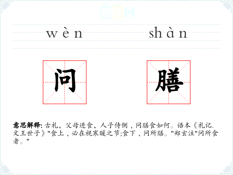 古礼,父母进食,人子侍侧﹐问膳食如何。语本《礼记.文王世子》"食上﹐必在视寒暖之节;食下﹐问所膳。"郑玄注"问所食者。"