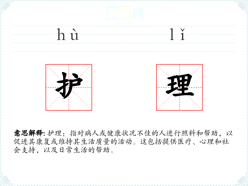 护理:指对病人或健康状况不佳的人进行照料和帮助,以促进其康复或维持其生活质量的活动。这包括提供医疗、心理和社会支持,以及日常生活的帮助。