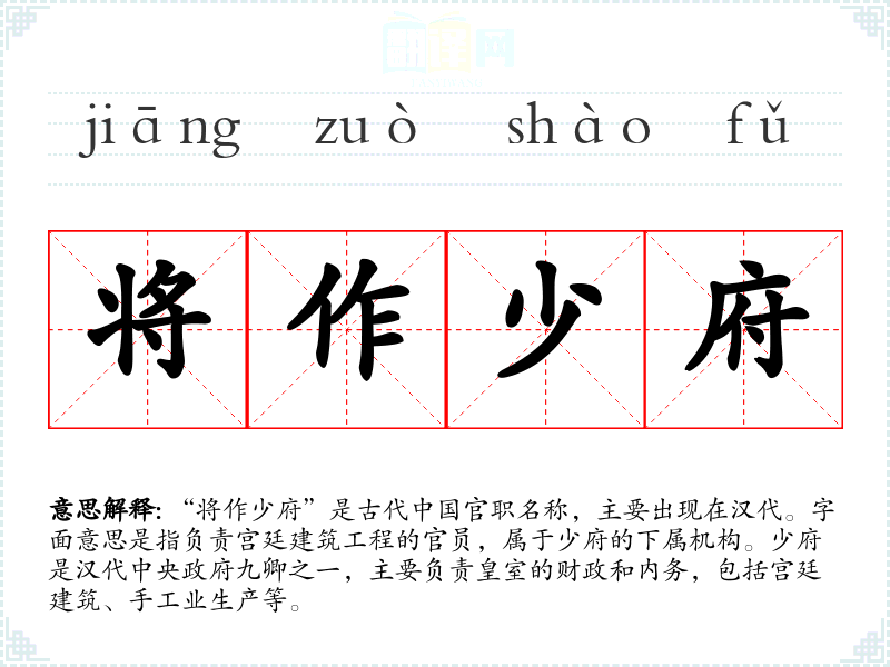 “将作少府”是古代**官职名称,主要出现在汉代。字面意思是指负责宫廷建筑工程的官员,属于少府的下属机构。少府是汉代中央政府九卿之一,主要负责皇室的财政和内务,包括宫廷建筑、手工业生产等。